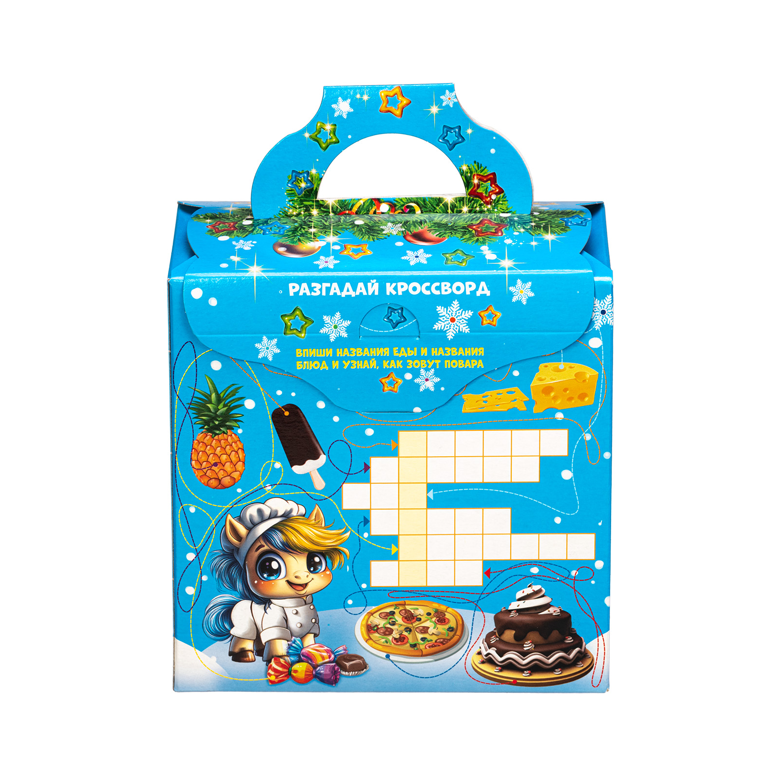 Ищете новогодний сладкий подарок для праздника в детском саду? Обратите внимание на набор “Поваренок Гоша”. За счет небольших размеров и грамотно подобранного конфетного состава этот подарок идеально подойдет для деток дошкольного возраста. Это коробочка нежно голубого цвета, со всех сторон украшенная разнообразными фигурными снежинками. На фронтальной части набора есть довольно милый рисунок: маленький очаровательной жеребенок в поварском кителе, который изучает книгу рецептов. Справа на упаковке как раз напечатан один из рецептов этой волшебной книги - обязательно приготовьте этот салат на новогодних праздниках!