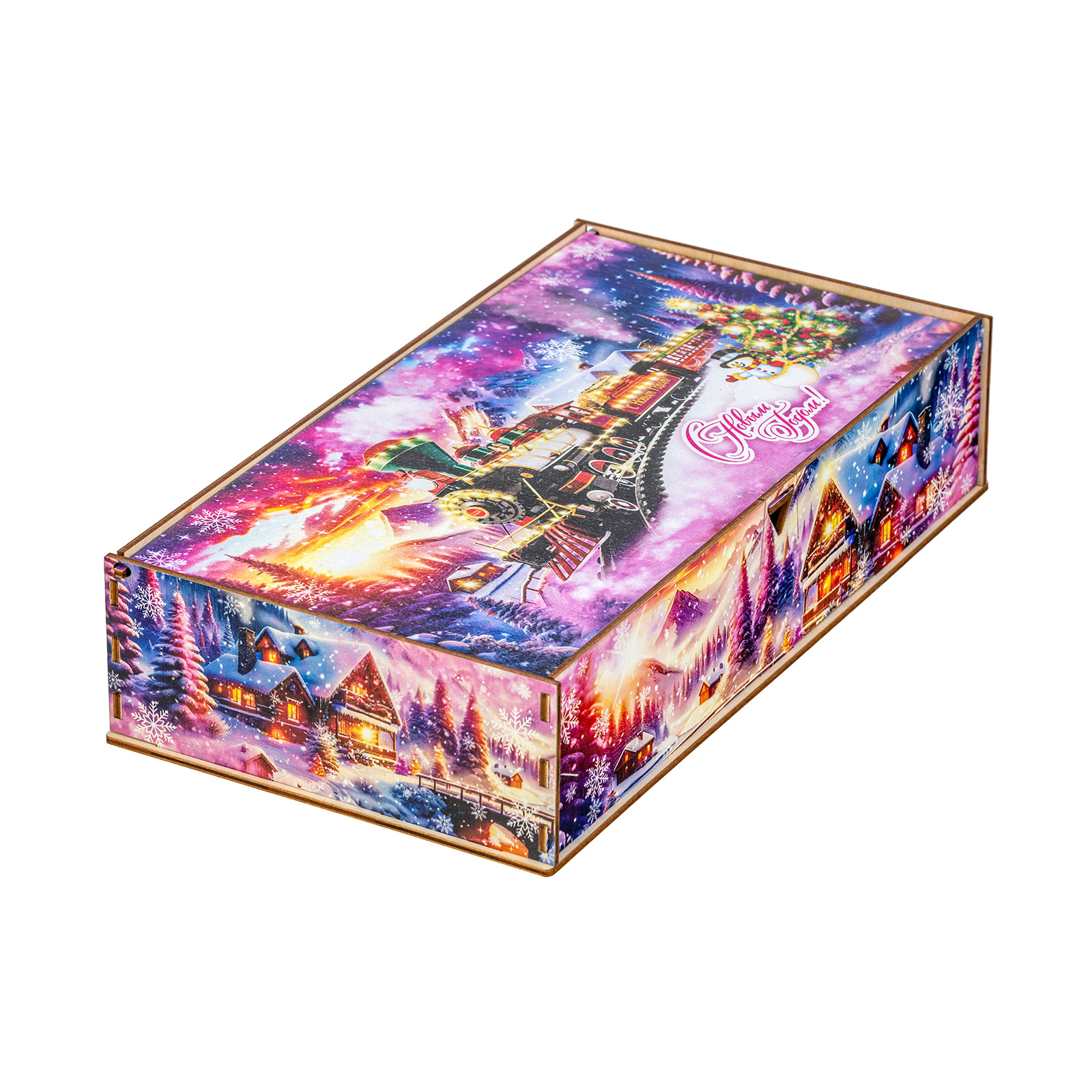 Секрет идеального новогоднего сладкого подарка прост: это яркая привлекательная упаковка и вкусные сладости внутри. “Снежный экспресс” - это подарочный набор, который как раз прекрасно подходит под эти характеристики. Это небольшая деревянная коробчка с очень необычным ярким оформлением. На ней изображен зимний вечер в небольшой деревне, рядом с которой по железной дороге весело мчится праздничный поезд. В этом поезде находятся счастливые люди, которые вот-вот смогут увидеться со своими родными и друзьями и отпраздновать с ними Новый год. В подарочный набор входит килограмм разнообразных сладостей, небольшой памятный сувенир и безграничная радость для всей семьи!