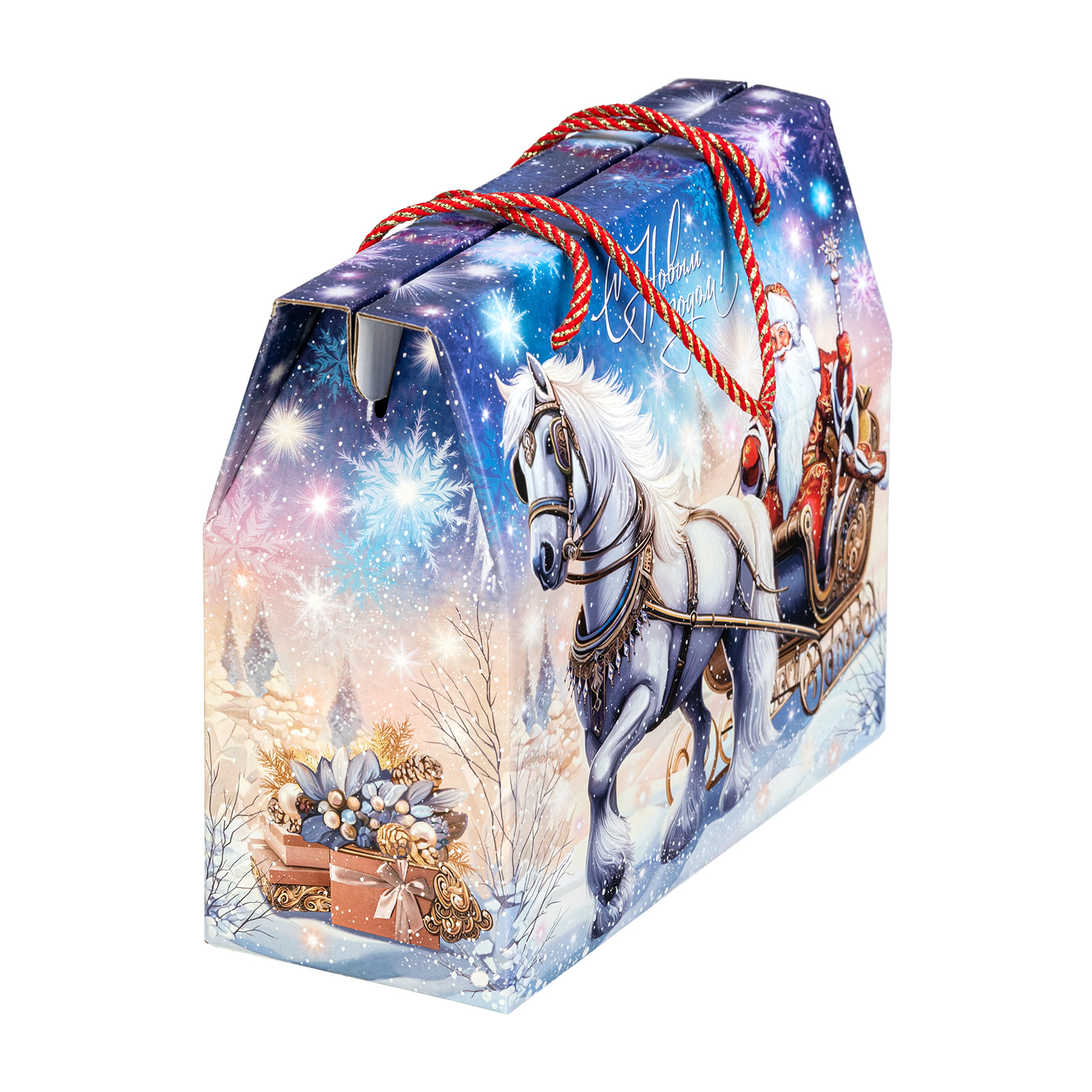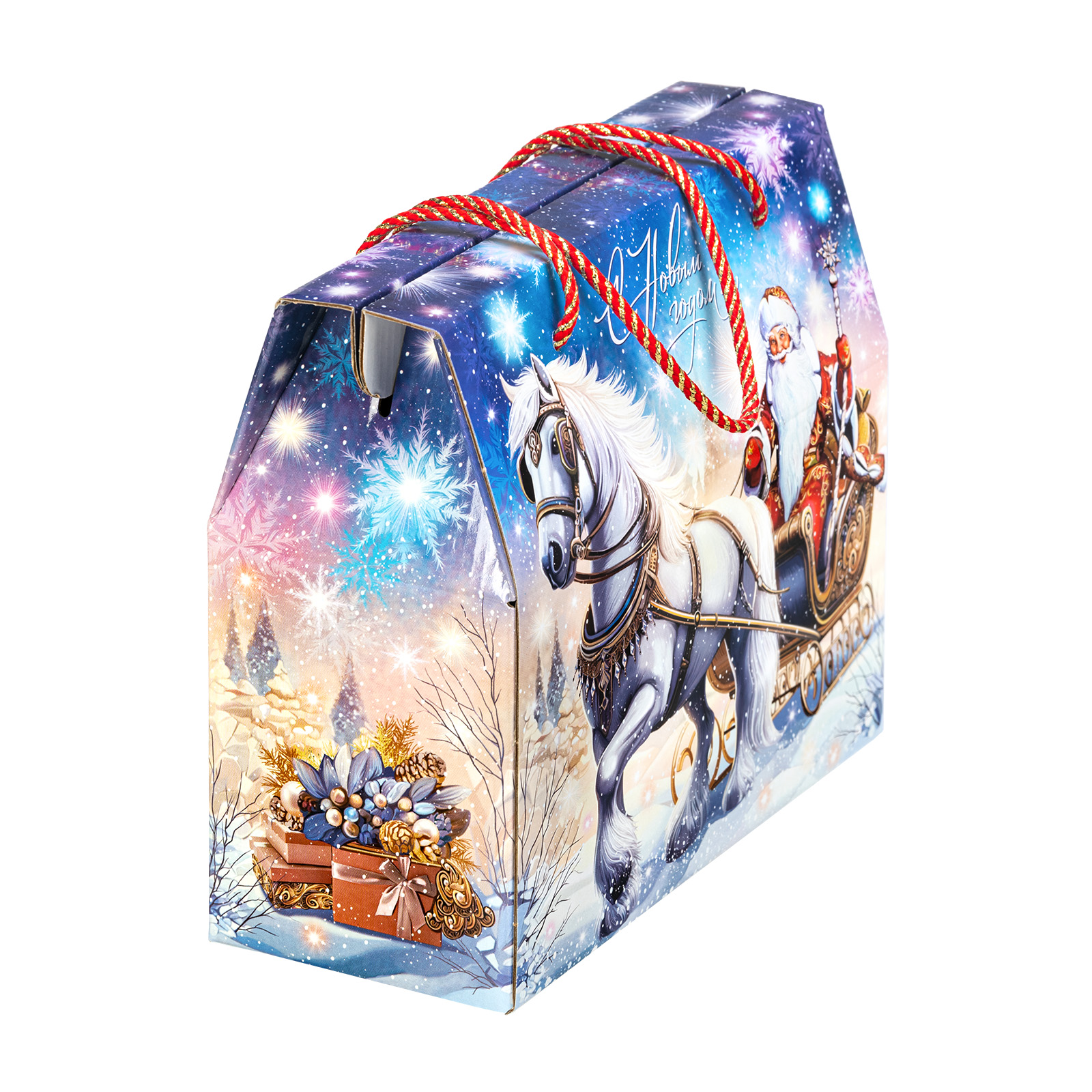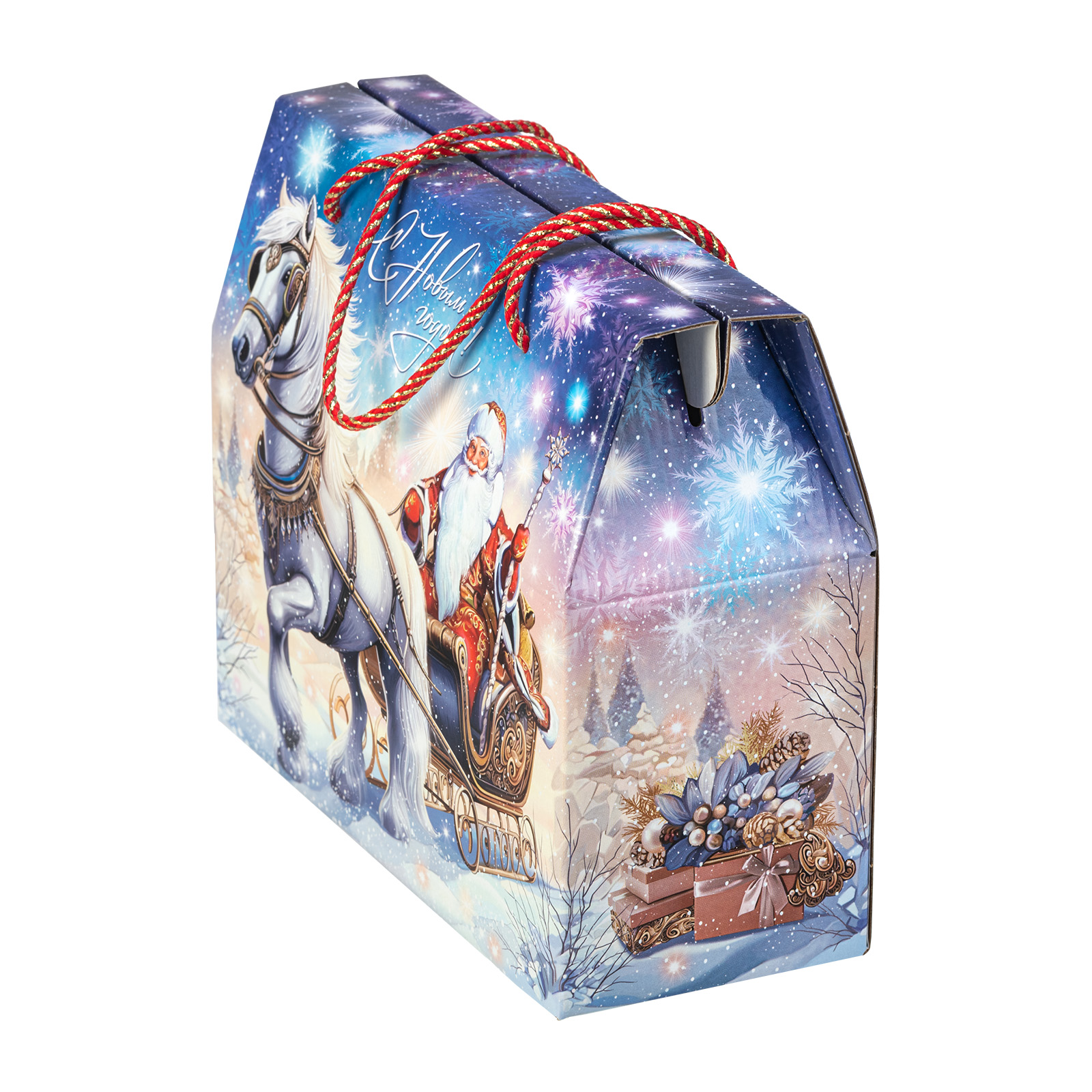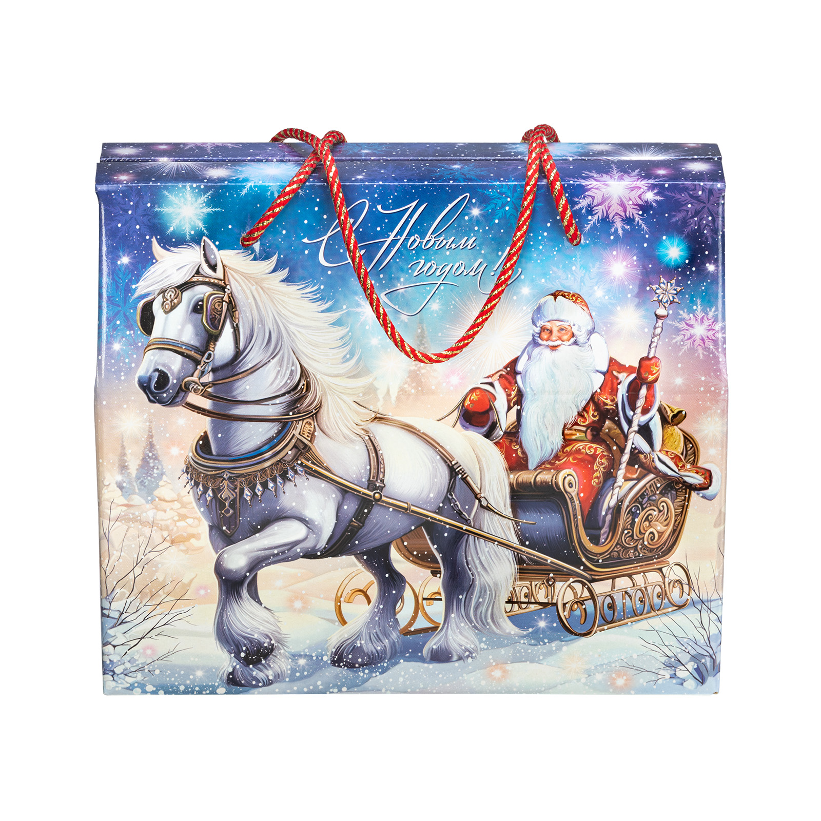 Новогодний сладкий подарок должен обладать не только замечательным вкусом сладостей, но и иметь яркую оригинальную упаковку, которую так и не терпится раскрыть! “Сумочка визит” - компактная картонная коробочка с удобной ручкой-шнурком красного цвета. Наличие ручки делает набор крайне удобным для транспортировки, что позволяет взять такой подарок в дорогу, чтобы вручить другу или родственнику из другого города. На сумочке изображен Дедушка Мороз в упряжке, а внутри этого подарка бережно хранятся отборные сладости, которые идеально подойдут к любому праздничному столу.